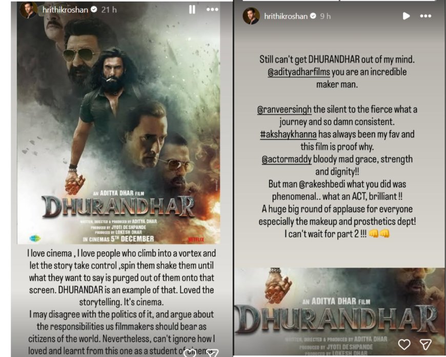 Hrithik’s response arrives on the heels of his collaboration with Aditya Dhar’s evolving spy universe in War 2. Around the same time, War director Siddharth Anand also joined the chorus of praise for Dhurandhar. Sharing his thoughts in a heartfelt note, he described the film as “nasha — it lingers with you long after. Every single department has delivered at its absolute best… I can’t wait to watch it again.”